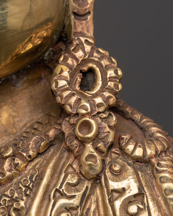 Crafted from copper, this finely sculpted statue of Guru Rinpoche, also known as a Buddhist tantric deity, stands 24.5cm tall and 15.5cm wide. Weighing 1.32kg, it is a significant spiritual art piece to add to your home altar, meditation space, or yoga studio. The elaborate patterns on his regal hat and the semi-wrathful expression on his face make this sculpture a focal point for spiritual inspiration and devotion.