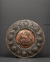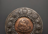 This Tibetan Buddhist wall hanging, crafted with rich workmanship, illustrates the Himalayan artists' deep artistic heritage. The combination of iron and copper represents strength and transformation, resulting in a spiritually charged artifact with increased positive energy. Whether displayed as a focal point in your home, temple, or meditation space, this Guru Rinpoche wall art reminds you of enlightenment and divine direction.