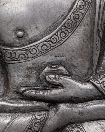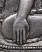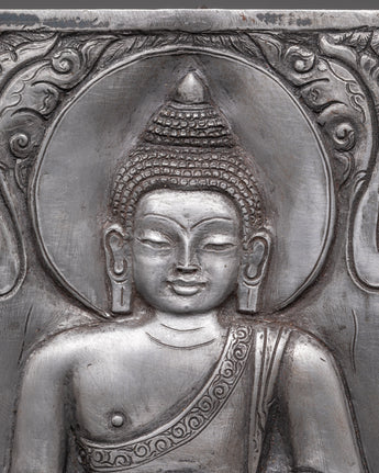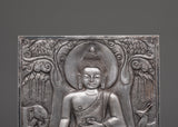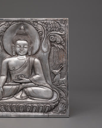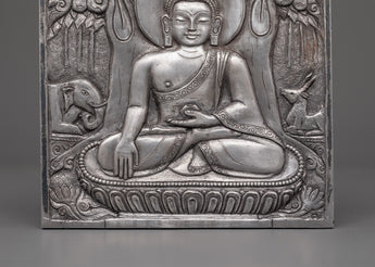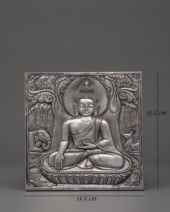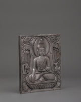 Hand-carved Buddha Wall Hanging is a finely made Iron Skhayamuni Buddha Sculpture depicting a peaceful meditation stance on a tree. This exquisite spiritual Buddha art depicts Lord Buddha sitting quietly on a lotus flower, surrounded by natural symbols. An elegant elephant and a tranquil deer guard the Buddha on the left and right sides, adding to the piece's spiritual mood. With a height and width of 15.5 cm, this Zen wall decor item is ideal for adding a peaceful touch to your house, meditation room, or sacred area.