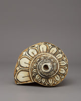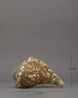 This hand-carved conch shell (Sankha), which is 12cm in height and 21cm in width, is a sacred ritual instrument with roots in Buddhist and Hindu traditions. Weighing 0.37kg, this finely sculpted conch represents power, victory, and heavenly authority. In Buddhism, the Sankha symbolizes the Buddha's speech, which spreads wisdom in all directions. In Hinduism, it is associated with divine energy and ritualistic offerings and is commonly utilized in temples and spiritual ceremonies. The resonating sound of the conch shell is thought to eliminate negativity, cleanse the environment, and welcome divine favors.