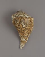 This hand-carved Sankha features a detailed depiction of Lord Ganesha, the revered elephant-headed deity of wisdom, prosperity, and obstacle elimination. Ganesha is shown in a majestic seated position, radiating divine elegance and spiritual force. His numerous arms indicate omnipotence, bearing sacred artifacts that represent intelligence, success, and protection. The intricate hand carving exemplifies great craftsmanship, making this conch a special and spiritually meaningful offering for altars, meditation places, and temple rituals. This Sankha is a powerful spiritual tool that captures the essence of holy sound and enlightenment, making it ideal for pujas, Buddhist ceremonies, and sacred home decor.