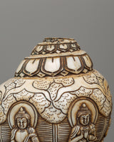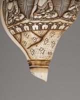 This beautiful hand-carved conch shell has deep spiritual meaning in Tibetan and Hindu traditions, making it an admired treasure. Known as the Shankha, it represents divine energy, auspiciousness, and purity. It is a remarkable item for meditation, prayer rituals, and spiritual offerings as it features the exquisitely carved images of Buddha. This conch shell, which is 10 cm tall and 20 cm wide, adds strength to any altar, shrine, or setting of meditation.