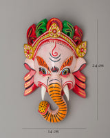 This hand-carved Ganesh mask is a unique and spiritually meaningful Hindu artwork symbolizing wisdom, prosperity, and protection. This stunning mask, skillfully carved from wood and painted with vibrant acrylic colors, measures 24 cm in height and 14 cm in width and weighs just 0.172 kg. The intricate details of Lord Ganesha's expressive face, curved trunk, and ornate crown reflect traditional craftsmanship and deep devotion to this revered deity.