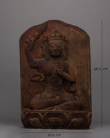 This Hand-Carved Manjusri Bodhi Wooden Bodhisattva Statue symbolizes the embodiment of knowledge and enlightenment. This exquisite statue, made of bodhi wood, is 46.5cm tall and 30.5cm wide and has meticulous details of Manjusri, the Bodhisattva of Wisdom. This statue is depicted wielding the fiery sword of wisdom in one hand and a lotus in the other, symbolizing removing ignorance and fostering insight. Its delicate carvings demonstrate the artisan's talent and passion, creating a timeless work.