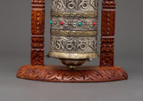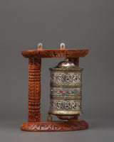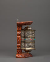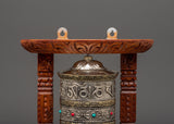This Hand-Carved Tibetan wooden prayer wheel (23cm tall, 20.5cm wide) is a lovely and sacred addition to any spiritual space. Crafted with care, this Buddhist spinner is designed to support your meditation practice by bringing mindfulness and serenity into your home. The elaborate design, crafted from quality copper, brass, and white metal, exemplifies traditional craftsmanship. The prayer wheel's wooden frame adds a warm, rustic atmosphere that is ideal for Himalayan altar decor or spiritual healing.
