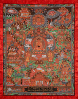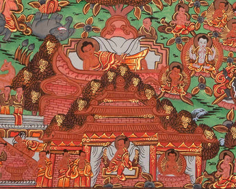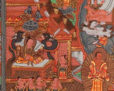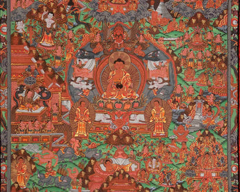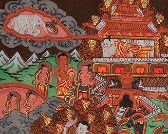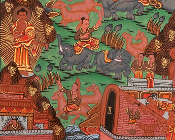 Explore the captivating tale of enlightenment with our Hand-Painted Buddha Life Story Thangka, embraced by a timeless vintage-style black brocade frame. The thangka, showcasing vibrant colors and a classic design, reflects the profound journey of Buddha's life from enlightenment under the Bodhi tree to the wisdom imparted during his teachings