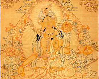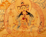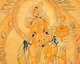 Embrace White Tara's serene presence with the help of this gorgeous thangka that was lovingly hand-painted. The beautiful white complexion and delicate facial features of the deity are highlighted in great detail by the Full Gold style. White Tara rests serenely atop a lotus throne, exuding a sense of peace and tranquility as the essence of compassion and healing. The painting's elaborate iconography further emphasizes the statue's spiritual significance. Every brushstroke is evidence of the artist's commitment and labor of love in producing a work of art that radiates grace and beauty. Displaying this White Tara thangka will allow you to draw the goddess' healing and compassion-filled blessings into your life.