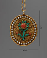 This locket is more than just adornment; it's a tribute to nature's beauty and human creativity. The silver body, adorned with 24k gold, emits a luminous aura. Turquoise and coral stone inlays add vibrancy and depth. It's a wearable masterpiece that celebrates the lotus' symbolism of purity and enlightenment, a testament to meticulous craftsmanship, and a link between nature's beauty and human creativity.