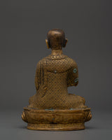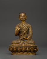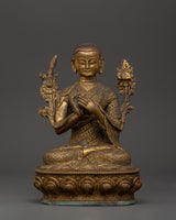 This handcrafted brass body of Tsongkhapa with Je Gyaltsab and Je Khedrup. This breathtaking trio of Tibetan Buddhist monks represents the enlightened heritage of the Gelug faith. In the center is Je Tsongkhapa, the great 14th-century teacher, philosopher, and founder of the Gelug school. Tsongkhapa, renowned for his profound insights, pure ethics, and scholarly teachings, is sometimes regarded as a manifestation of Manjushri, the Bodhisattva of wisdom. His statue is 20.5 cm in height and 14.5 cm in width, and exudes presence and calm. Flanking him are his devoted heart followers, Je Gyaltsab and Je Khedrup, 18 cm tall and 13 cm wide, captured in contemplative silence with hands uplifted in the Abhaya Mudra, representing fearlessness and protection. All three are seated on exquisite lotus moon discs representing purity, enlightenment, and the spiritual path.