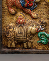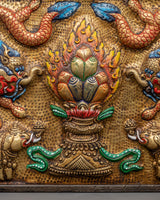This wall hanging, crafted with meticulous care, exemplifies traditional Himalayan creativity. The blazing lotus signifies enlightenment and purity, while the dragons protect sacred energy. Elephants represent wisdom and spiritual foundation. This artwork is ideal for any shrine, altar, or holy area, evoking bright energy and spiritual importance.