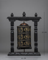 With its beautifully finished copper body and finely carved wood frame, this magnificent handcrafted Buddhist prayer wheel will transform your room with its profound spiritual energy. This prayer wheel, which combines traditional workmanship with profound spiritual meaning, is a commanding presence, standing an incredible 52 cm tall by 41 cm wide and weighs 2.98 kg.