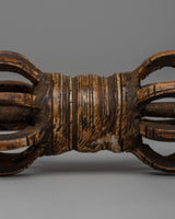 This hand-carved Vajra, also known as a Tibetan Dorje, is a sacred ceremonial item with deep symbolic meaning in the Vajrayana Buddhist tradition. This Vajra, crafted from ethically obtained buffalo bone, represents the indestructibility of truth, the ability to overcome challenges, and the balance between samsara and Nirvana. In Tibetan rituals, the Vajra is frequently combined with a bell to represent the balance of male and feminine forces, compassion, and successful action.