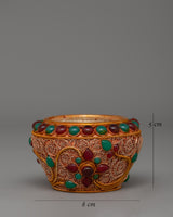 This stunning handcrafted copper ritual offering bowl, embellished with colorful coral and turquoise artificial stones, will elevate your altar space. The bowl exhibits traditional filigree metalwork and is delicately gold-plated, showcasing the elaborate elegance of Himalayan handicraft. A significant addition to any spiritual or meditative setting, this sacred bowl represents dedication, beauty, and cultural history and is used in Buddhist rituals for offering-making.