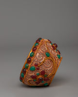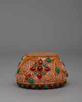This handcrafted bowl is ideal for altar offerings or sacred displays, weighing 0.142 kg and measuring 5 cm in height by 8 cm in width. Every element reflects centuries of ritual practice, from the reflecting jewel highlights to the swirling filigree patterns. In Tibetan customs, the Golpa Bowl is frequently used to store offerings of rice, water, or symbolic objects to purify intentions, attract blessings, and collect karma. Perfect for spiritual seekers, cultural collectors, or as a meaningful one-of-a-kind present.