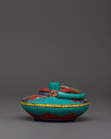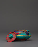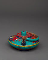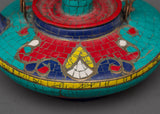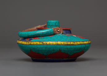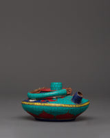 This Handcrafted Copper Teapot, inlaid with vivid turquoise, deep lapis lazuli, and warm coral stones, will provide rich color and cultural appeal to any area. This decorative item, measuring 12.5cm in width and 10cm in height, is inspired by traditional Tibetan design and would be ideal for altars, meditation spaces, or bohemian-style settings.