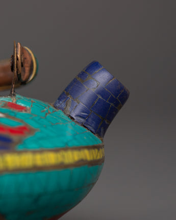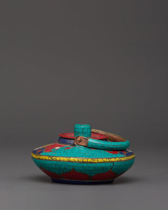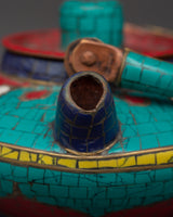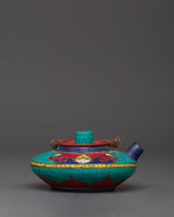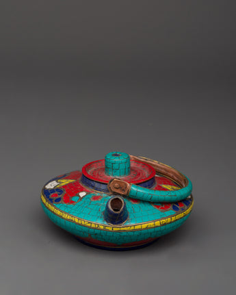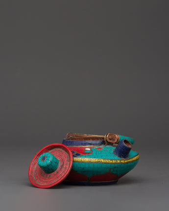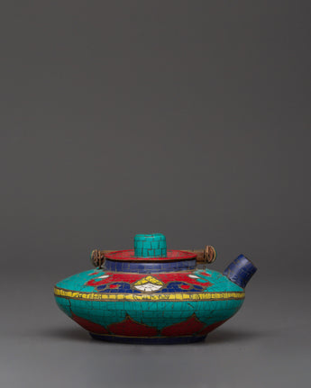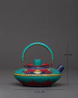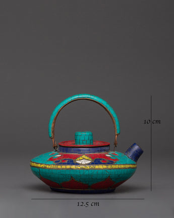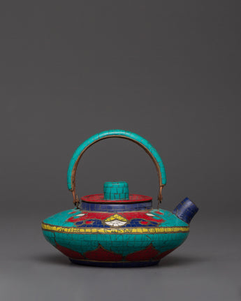 The copper body serves as a foundation for the delicate mosaic inlays, which artists of Himalayan workmanship carefully create. Turquoise represents protection and connection, while coral represents healing and energy. Lapis lazuli represents inner truth and spiritual understanding. With its low, rounded shape and ornate handle, this teapot gives a significant and vibrant accent to any religious or creative environment.