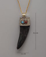 This gorgeous handcrafted, ethically sourced goat horn pendant features colorful coral and turquoise stones, enhancing its natural appeal. This Tibetan-inspired locket, which measures 8.5 cm in height and 2.3 cm in breadth, is a masterwork of traditional craftsmanship and spiritual symbolism. Due to the exquisite silverwork that embraces the stones, this necklace is a statement piece and a significant accessory.