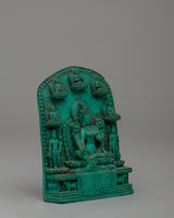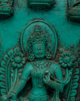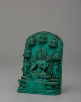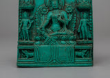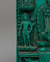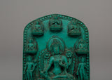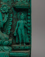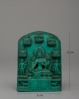 With this exquisitely crafted powder resin statue, you can incorporate the blessings of the admiring protector of Tibetan Buddhism, the Handcrafted Green Tara Statue, into your sacred place. This elaborate 10 cm-tall Green Tara plaque represents the goddess in an elegant sitting position surrounded by affordable enlightened figures, emanating tranquility, knowledge, and divine protection. Known as the "Mother of Liberation," Green Tara provides prompt support in conquering difficulties, fears, and obstacles.
