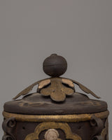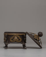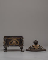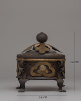 Enhance your spiritual rituals with this Handcrafted Iron Incense Burner, a remarkable combination of traditional craftsmanship and utility. This incense burner is made of iron and is meticulously embellished with 90% silver and brass inlays, giving it an elegant and timeless appearance. Its (14 cm in height and breadth) and its 0.65 kg weight, make it a durable yet portable piece ideal for home altars, meditation areas, or an excellent decorative object.