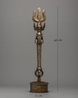 In Vajrayana Buddhism and Hinduism traditions, this artisanal iron Trishul symbolizes spiritual transcendence, protection, and destruction. This intricately crafted ritual trident, which stands 46 cm tall, represents the tripartite powers of creation, preservation, and destruction—energies frequently connected to Lord Shiva and other Tantric Buddhist deities.