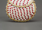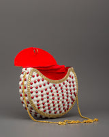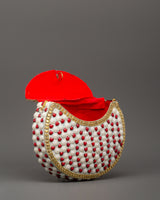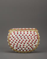 This Handcrafted Pearl and Coral Side Bag will add a touch of elegance to your collection. This Fashion-inspired evening purse is 21cm wide and 15.5cm high, with an intricate arrangement of white pearl beads and beautiful red coral decorations. The bag is wonderfully embellished with Artificial stones, adding to its ageless appeal—ideal for festive occasions, weddings, or an eye-catching evening accessory.
