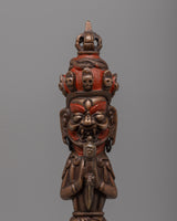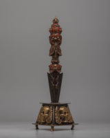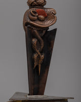 Discover the spiritual power of this handcrafted Phurba, a ceremonial dagger deeply rooted in Tantric Buddhist traditions. Intricately crafted from brass with an oxidized iron base, this sacred artifact embodies the essence of transformation and protection. Each element reflects the profound craftsmanship of Nepalese artisans, ensuring its authenticity and cultural significance.