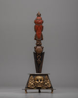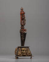 Phurba, known as Kila in Sanskrit, symbolizes the destruction of obstacles and negativity. Originating from ancient Vedic traditions, it has been revered as a powerful spiritual tool, capable of neutralizing forces that hinder one's path to enlightenment. Its three-sided blade represents the eradication of ignorance, desire, and hatred—key barriers to spiritual growth. At the top, the carved deity invokes the Vajrakila Buddha, a divine figure in Tibetan Buddhism known for vanquishing evil and guiding practitioners toward liberation.