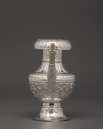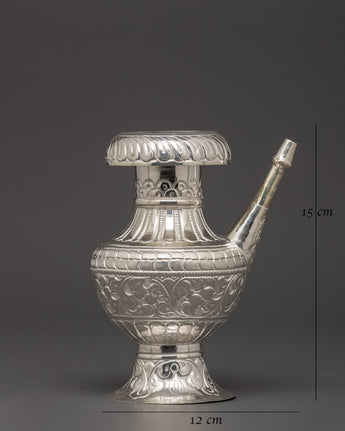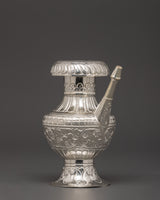This stunning Handcrafted Pure Silver Karuwa is a traditional Tibetan ceremonial vessel, carefully fashioned for sacred ceremonies and spiritual sacrifices. This beautiful pot, about 15 cm in height, has ornate floral and geometric engravings throughout its circular body, an elegantly angled spout, and a beautifully domed top. The dazzling silver surface represents purity, reverence, and spiritual clarity.