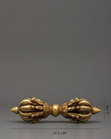 Handcrafted Ritual Vajra. In Tibetan Buddhism, Dorje is a powerful spiritual symbol of power, enlightenment, and heavenly protection. This handcrafted bronze Vajra, measuring 5cm tall and 16.5cm wide, is a vital tool in Tibetan Buddhist rituals, representing the merging of wisdom and compassion. It is used in prayers, meditations, and ceremonies to protect against negative energies and channel spiritual strength.