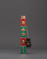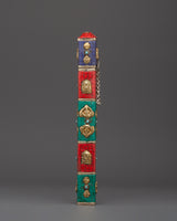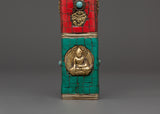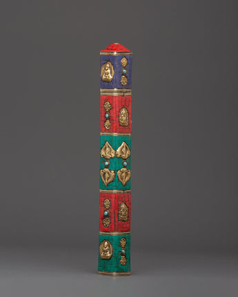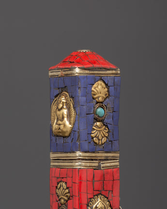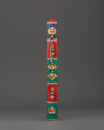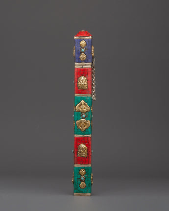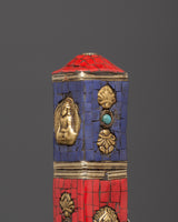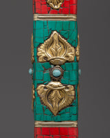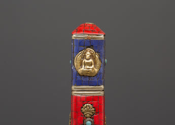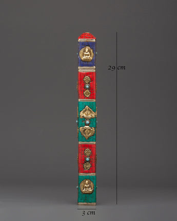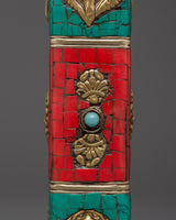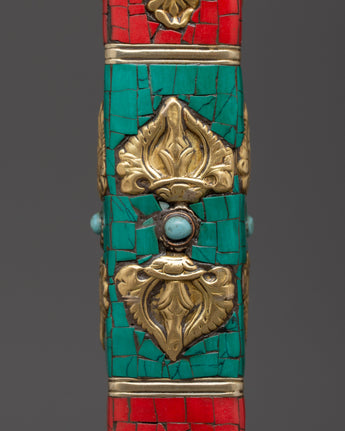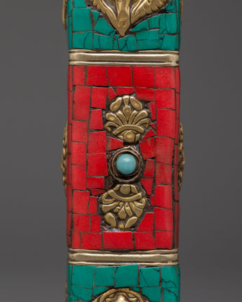 Enhance your spiritual practice with this Handcrafted Ritual Incense Holder for Meditation, which is wonderfully decorated with symbolic Buddha designs and delicate turquoise and coral inlays. This incense holder is 29 cm tall and 3 cm broad, exemplifying Tibetan craftsmanship's rich creative tradition. Its brass body is creatively constructed, with bright colors and spiritual symbols. This incense holder, ideal for meditation rooms, ceremonial altars, or as a unique home décor piece, exudes tranquility and dedication.