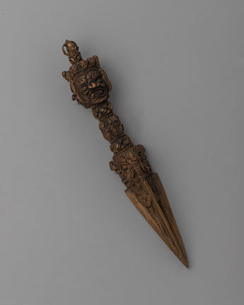 In Tibetan Buddhism, the ritual dagger known as Phurba, which is made on a oxidized copper body, has great spiritual importance. The main purpose of this ritual weapon is to remove spiritual obstacles and bad energy from ceremonies. A finely crafted half Vajra, signifying power and the unbreakable essence of wisdom, sits atop the Phurba. A furious god beneath the Vajra is shown, signifying strong defense and the capacity to overcome evil forces. The dagger's base has a triangle-shaped blade that is finely decorated with Buddhist imagery, representing the dismantling of ignorance and delusions.