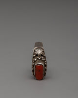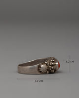 The bright shades of the real coral stone and the elaborate silver band decoration combine to create an elegant design that complements formal and informal settings. This ring displays style and craftsmanship, making it an excellent choice for a personal statement piece or a thoughtful present for a loved one.
