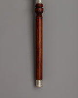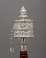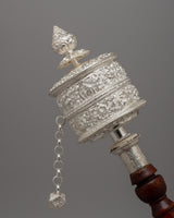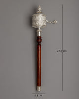 Each prayer wheel is precisely manufactured to ensure smooth rotation and long-term durability. The silver's luster, along with the rich texture of the hardwood handle, heightens its aesthetic appeal, making it an ideal complement to any sacred place or home shrine. Spinning this wheel represents the repetition of thousands of mantras, which provides spiritual benefits according with Tibetan Buddhist teachings. Its lightweight design (0.41kg) makes it simple to hold and utilize during contemplative sessions or rituals.