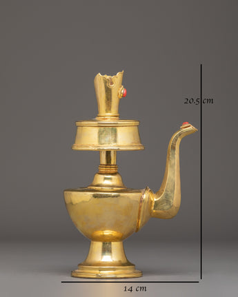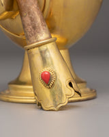 This Tibetan Handcrafted Bhumba features a copper body carefully gold-plated, giving it an exquisite, dazzling appearance. The use of imitation coral stones adds to the appeal of this piece by giving its design a burst of brilliant color. Standing at 20.5 cm in height and 14 cm in breadth, this ornamental object is both tiny and exquisite, making it ideal for exhibition in any sacred or spiritual area. It weighs 0.51 kg and has a balanced weight, while being easy to handle and set on altars, shelves, or meditation areas.