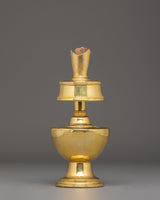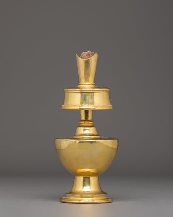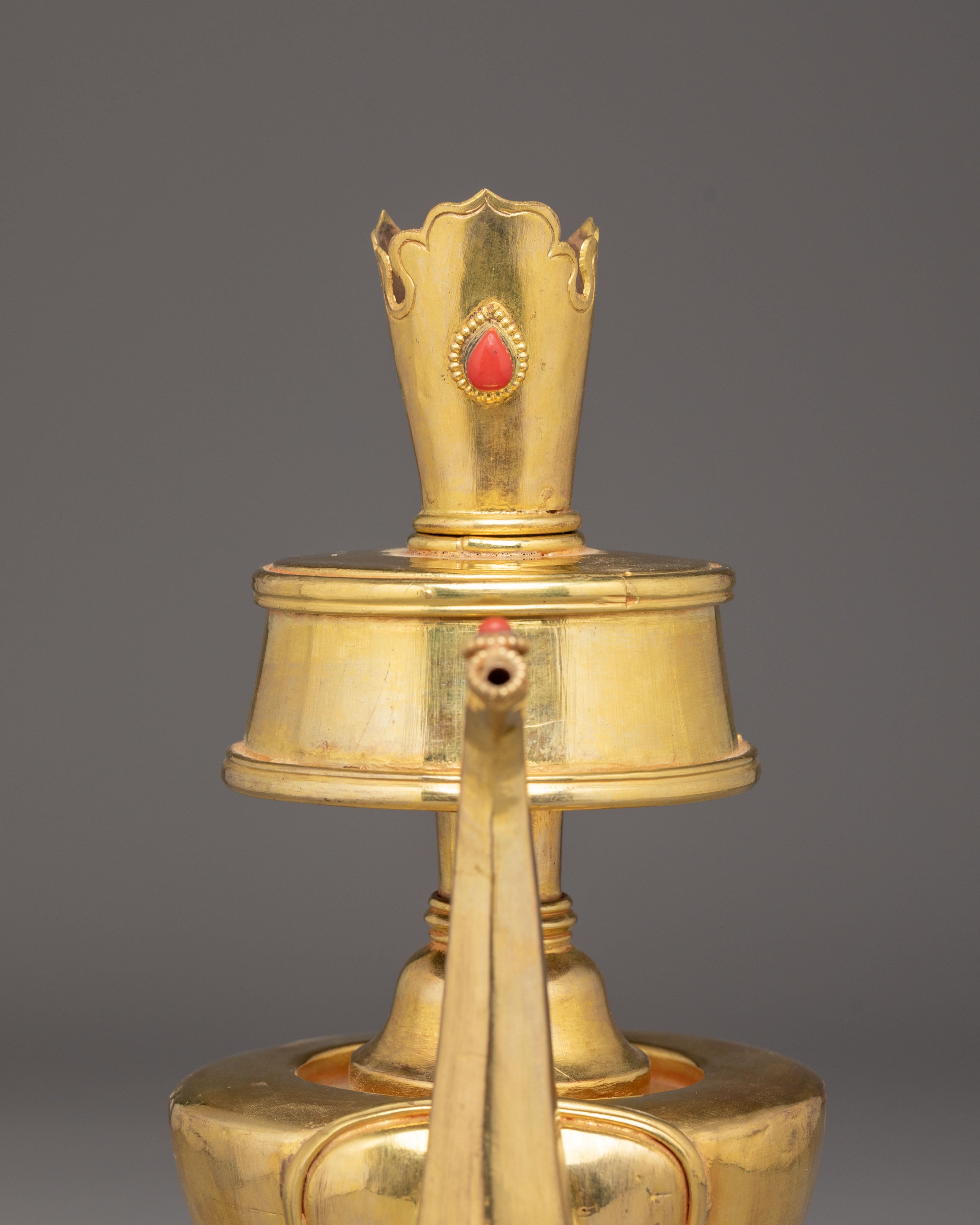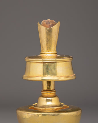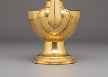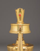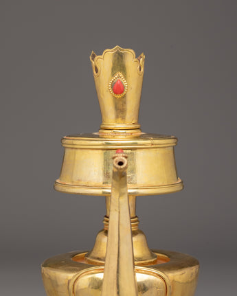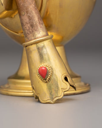 Our Tibetan Handcrafted Bhumba is a traditional ritual vessel commonly used in Tibetan Buddhism to symbolize affluence and spiritual awakening. The design contains elaborate gold-plated details with a coral stone in the center, which represents vitality, energy, and harmony. The Bhumba is often connected with religious sacrifices, and it is thought to have the power to bring prosperity, spiritual progress, and heavenly favors into one's life. It is both a ritualistic object and a decorative artifact, representing the essence of Tibetan spiritual practices.