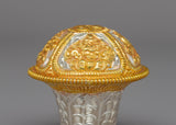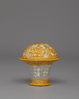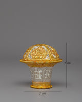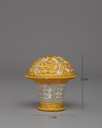 This Handcrafted Tibetan Stick Cap is a beautifully designed spiritual accessory constructed of a copper body electroplated with gold and silver for a lovely, radiant finish. This cap measures 7 cm in height and width and has a circular base of 3.5 cm. It includes elaborate traditional motifs with significant symbolic importance in Tibetan Buddhism. Gold and silver plating increases the piece's spiritual energy and elegance, making it an ideal complement to any Buddhist altar or sacred area.