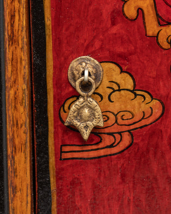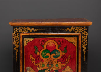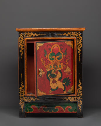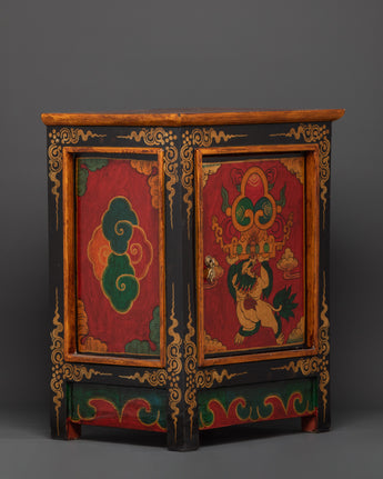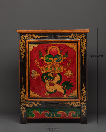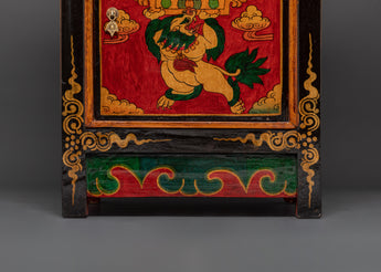 Aside from its beautiful appearance, this Tibetan wooden cabinet provides efficient storage with ample space to keep your prized possessions, books, or decorative pieces. The handcrafted design ensures that each cabinet is unique, making it a special addition to any house. This cabinet serves as both a storage unit and a decorative accent piece, combining cultural significance with practical functionality. Whether used to house precious artifacts, serve as a focal point in your spiritual space, or make a statement in your home design, this cabinet's beauty and symbolic significance will transform your surroundings. The snow lions painted on the front ensure that this garment is both utilitarian and spiritually powerful.