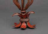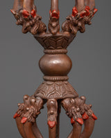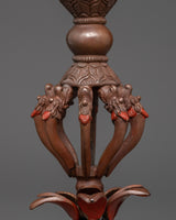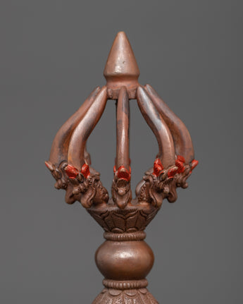 This oxidized copper Vajra, also known as a Dorje, is 23cm tall and 6.5cm wide and weighs a substantial 0.75kg. Beautifully constructed with complex features, it is a potent symbol of indestructibility and spiritual strength in Vajrayana Buddhism. The Vajra is used in rituals and meditation to represent eternal truth and the union of wisdom and compassion.