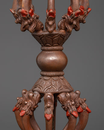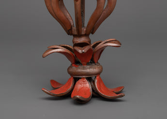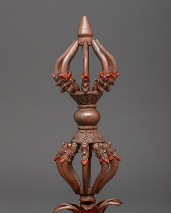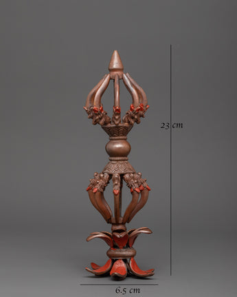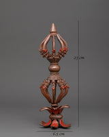 They represent the Five Buddhas of the cosmic direction (Vairochana, Amitabha, Ratnasambhava, Amoghasiddhi, and Akshobhya) and the five kayas of the Anuttarayoga tantras. The Vajra is based on a stylized lotus stand, signifying purity emerging from the commonplace. It is ideal for spiritual practitioners, collectors, or as a centerpiece on a personal shrine. Its presence sharpens attention, protects against negativity, and connects the spiritual practitioner with Tibetan knowledge.