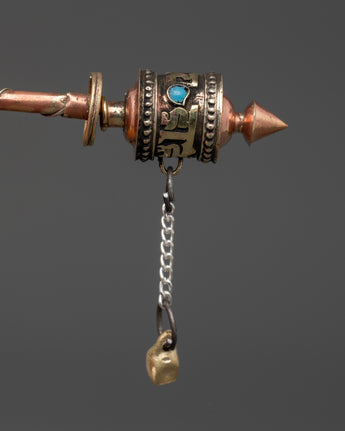This Handheld Tibetan Prayer Wheel, elegantly crafted from copper and brass, features a turquoise inlay and can help you cultivate awareness in every moment. This small mantra wheel is suitable for personal use, travel shrines, or altar collections, as it fits comfortably in your palm and is designed for spiritual practitioners and those seeking mindful living. It has great blessings and profound importance despite its compact appearance.