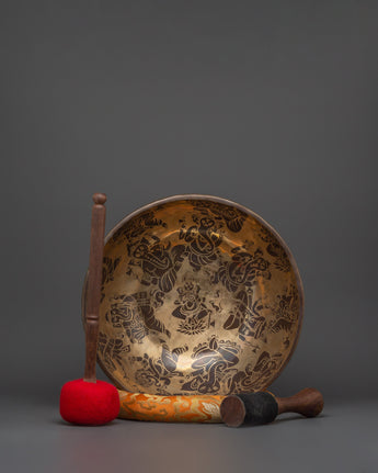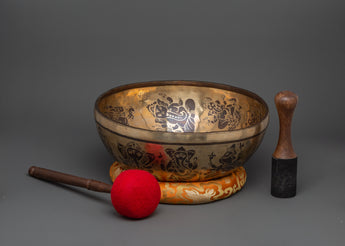 Our Handmade Brass Tibetan Singing Bowl is handcrafted with painstaking attention to detail and has the Flower of Life motif, representing harmony and spiritual balance. This singing bowl is ideal for meditation, sound healing, and chakra alignment, producing deep, relaxing tones that enrich your spiritual practice. Its exquisite brass body not only produces harmonious vibrations, but it also adds a spiritual element to your area. This singing bowl, ideal for yoga studios, meditation areas, and personal rituals, is a must-have instrument for mindfulness and inner serenity.