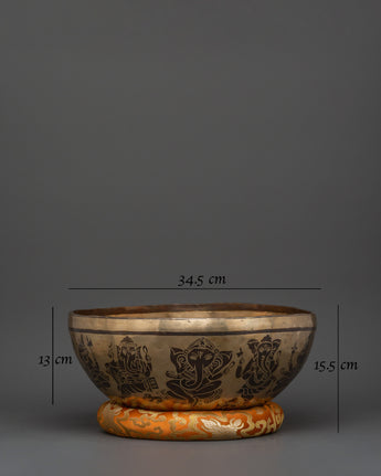 This Tibetan Singing Bowl Set includes a wooden mallet, a red stick, and a cushion pad to provide stability and comfort during meditation periods. The bowl is 13.5cm high without the base, 15.5cm with the base, has a diameter of 34.5cm, an interior depth of 13cm, and weighs roughly 3.70kg. The stick is 20.5cm tall and 5cm wide, weighing 0.226kg; the red stick is 34cm tall and 9cm wide, weighing 0.292kg. The kit, with accessories, weighs 4.218kg. Made of brass, this meditation sound bowl produces powerful vibrations promoting relaxation, stress alleviation, and spiritual connection.