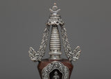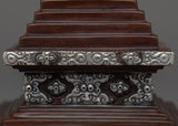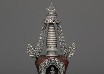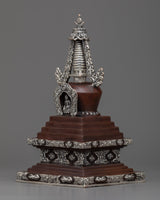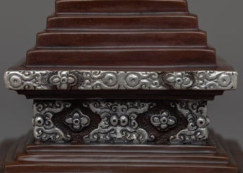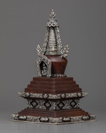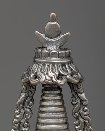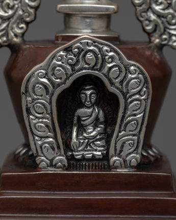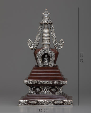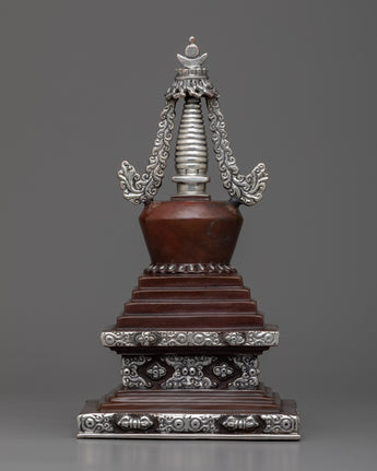 Prepare to be captivated by our Handmade Copper Stupa's exquisite beauty! This stupa is a true masterpiece, meticulously crafted on a oxidized Copper body and adorned with mesmerizing silver plating. It's intricate details and flawless design will astound you. This stunning piece is a must-have for any collector or spiritual seeker. Allow the stupa's sacred energy to elevate your space and bring peace to your surroundings. Immerse yourself in its divine presence and embark on a spiritual journey. Don't pass up this extraordinary find!
