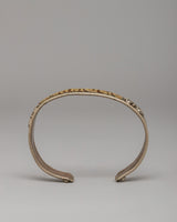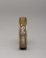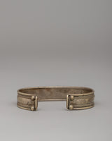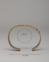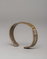 This gorgeous handcrafted cuff bracelet is the ideal combination of faith and craftsmanship. It is made of white metal and has the sacred mantra inscribed in gold-tone writing, which represents compassion, wisdom, and spiritual progress. The exquisite vajra carvings on either side add to the bracelet's attractiveness, and its unisex form makes it suited for anybody. With a height of 1.2 cm, a width of 6.2 cm, and a circumference of 18 cm, this lightweight (20g) bracelet offers a comfortable and adjustable fit for everyday use or special events.
