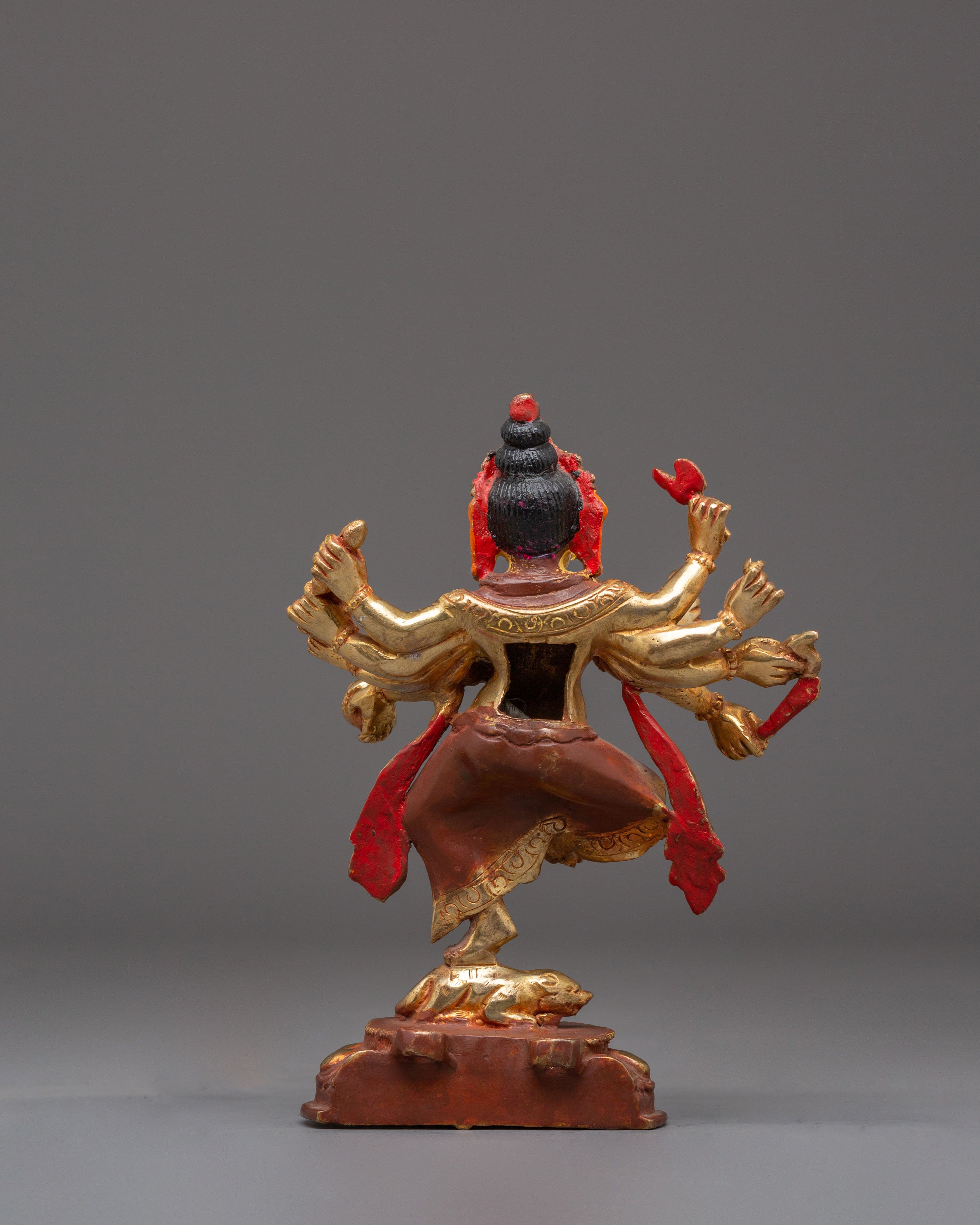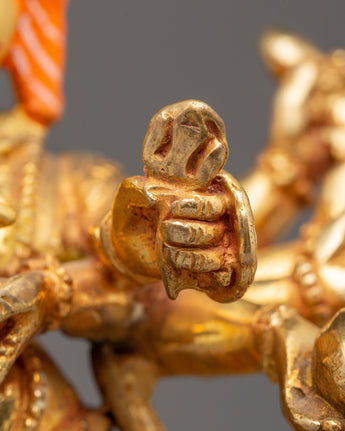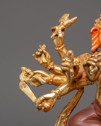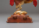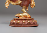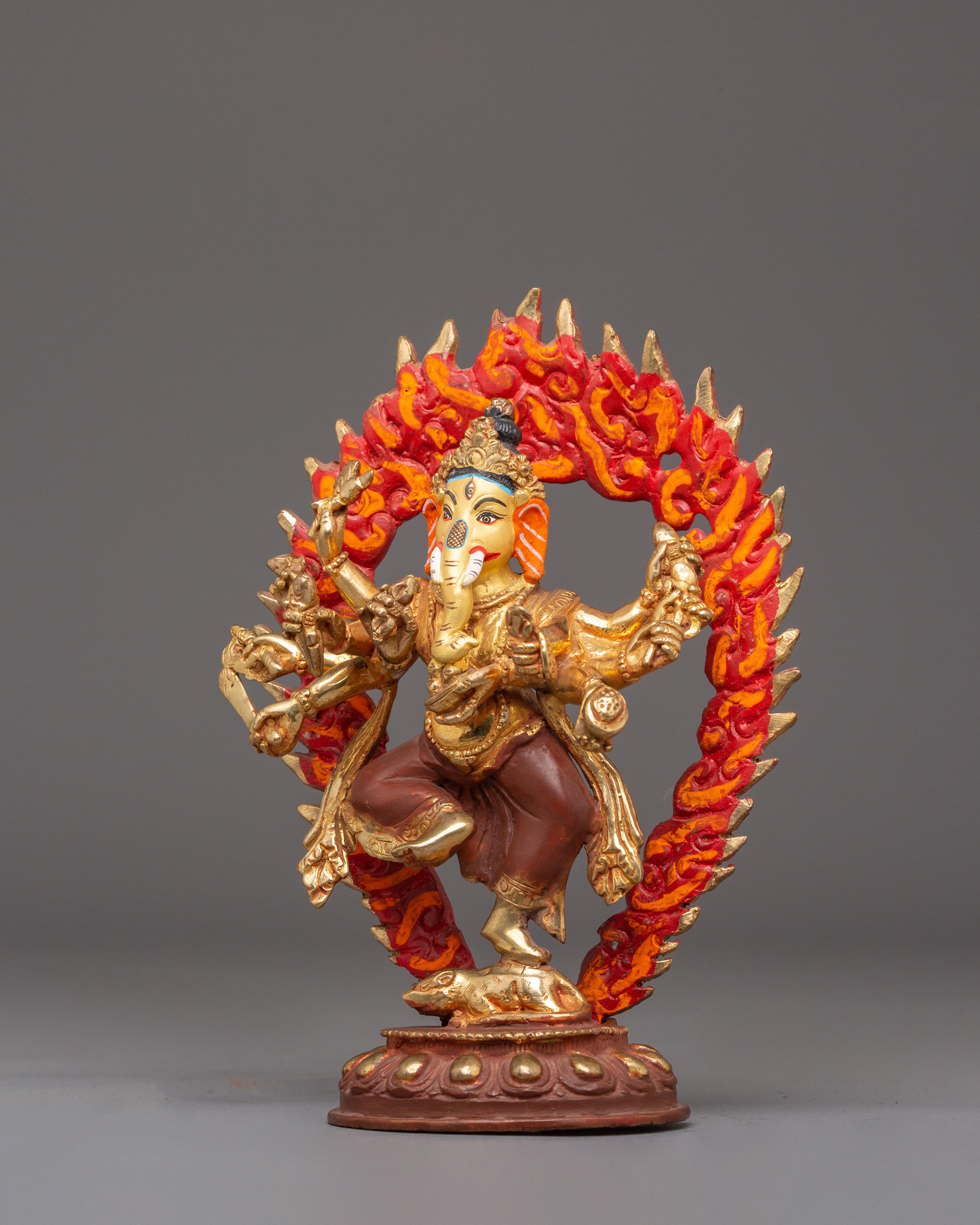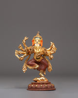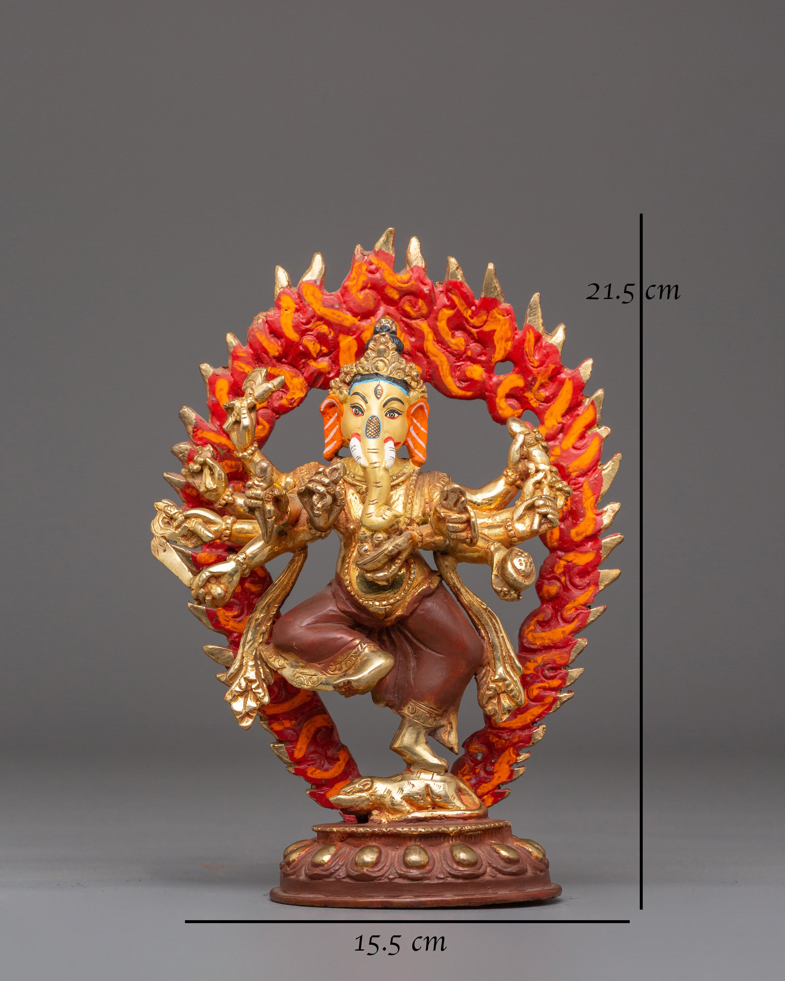 The Divine Statue of Lord Ganesh is the ideal size addition to any area, measuring 21.5 cm in height and 15.5 cm in breadth. This statue, which weighs 1.14 kg, has a copper body, is gold-plated for an elegant appearance, and has vivid acrylic accents that bring Lord Ganesh's beautiful characteristics to life. It is an amazing work of art that may be seen in homes, workplaces, or places of worship because of its fine details and grand air.