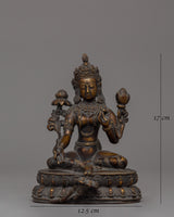 Bring the essence of compassion, wisdom, and divine energy into your house with this stunning Green Tara statue. Handcrafted from a copper body and embellished with an enhanced antique finish, this masterpiece is more than simply a decorative piece; it is a spiritual centerpiece. This statue is an everlasting emblem of serenity and enlightenment, thanks to its detailed features, which range from her calm look to the flowering lotus she holds.