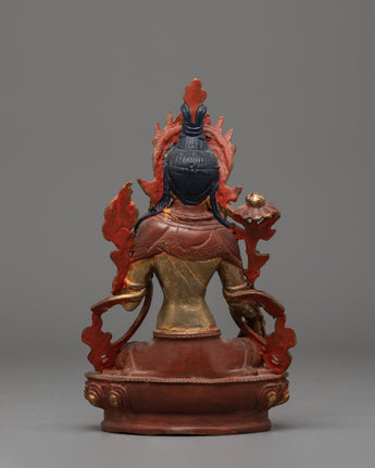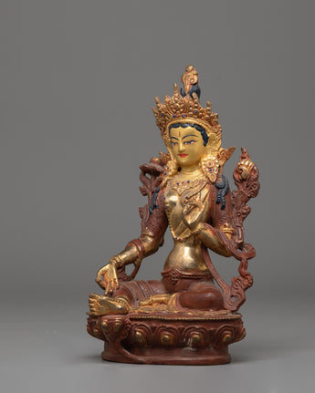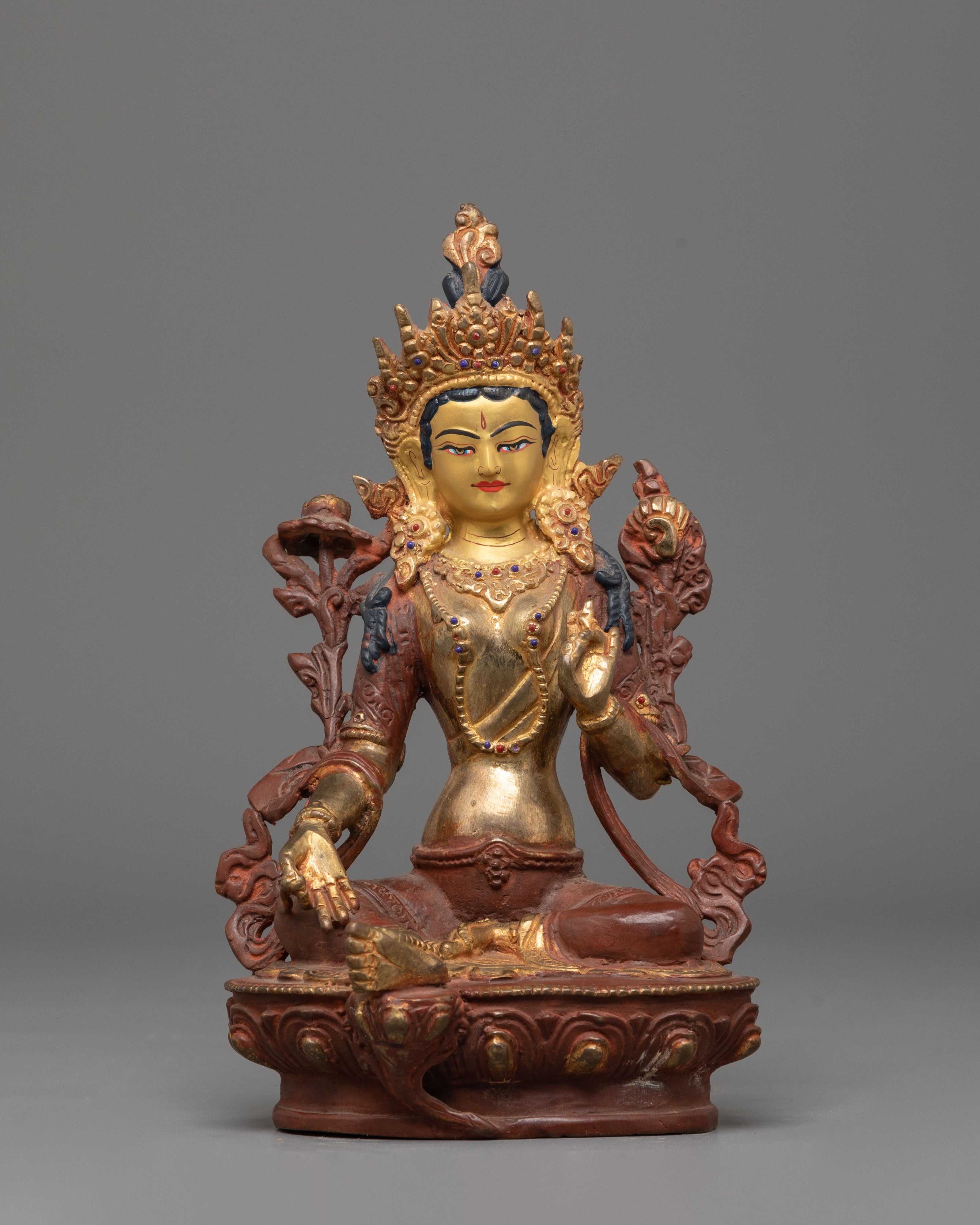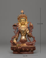 This Handmade Statue of Shyama Tara is a beautiful and deeply spiritual representation of the revered Tibetan Buddhist deity. Standing at 22.5 cm in height and 14 cm in width, this exquisite figure is meticulously crafted from oxidized copper and features gold-plated elements, adorned with acrylic colors and artificial stones, including coral and turquoise. Shyama Tara, known as the "Green Tara" in some traditions, is the embodiment of compassion, offering protection and swift aid to those in need, especially in moments of crisis and spiritual distress.
