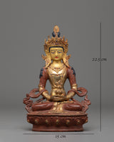 This Handmade Statue of the Tibetan Deity Amitayus is an exquisite depiction of the Buddhist deity of longevity and wealth. Standing 22.5 cm tall and 15 cm wide, this beautifully created statue is comprised of oxidized copper, gold plating, acrylic color, and artificial stones such as turquoise and coral. Amitayus, also known as the Buddha of Longevity, is revered in Tibetan Buddhism for his capacity to grant long life and good health, making this statue an essential addition to your home or spiritual space.