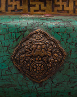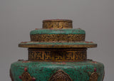 Add a touch of cultural refinement to your house or shrine with this Handmade Dhupur Rice Pot, made of metal such as brass and copper and embellished with beautiful imitation turquoise stone inlays. This magnificent piece, measuring 24.5cm tall and 25cm broad, exemplifies traditional workmanship with a rich design of etched patterns and artistic embellishments. The brilliant turquoise inlay adds to the pot's elegance, representing protection, healing, and peace in traditional Tibetan culture.