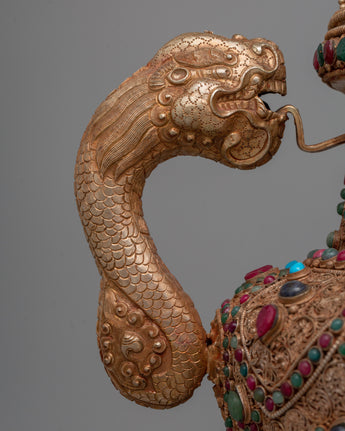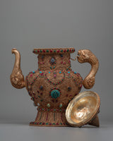 The pot's intricate Tibetan Buddhist artwork highlights Tibet's rich cultural legacy and its spiritual significance. The pot's beauty is enhanced by the inlaid stones and the gold and silver plating, turning it from a useful object to a priceless ornamental piece suitable for use in sacred spaces or during ceremonies. This Tibetan tea pot is a treasured piece for collectors or anyone who appreciate Tibetan Buddhist art and culture since it perfectly combines traditional artistry with spiritual connotation.